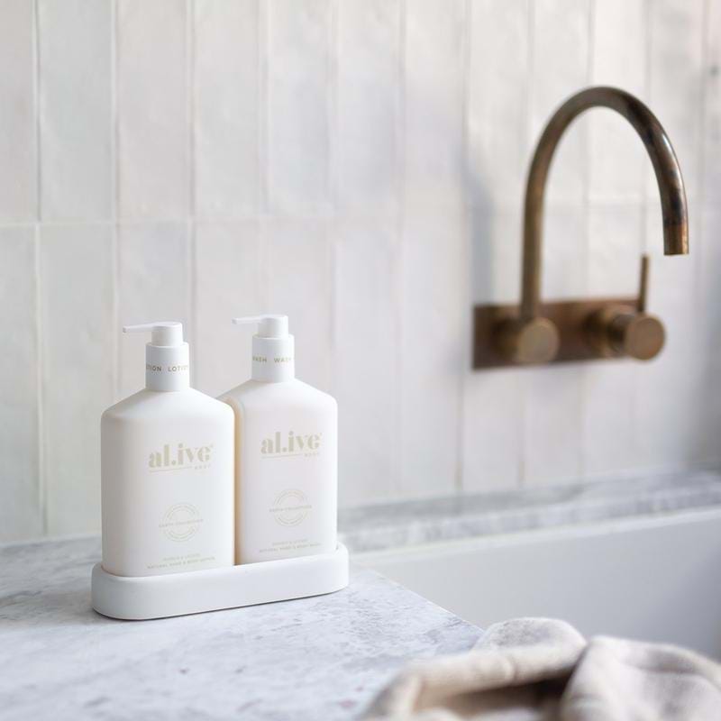 The Duo includes a 500ml hand & body wash, 500ml hand & body lotion and a matching tray.
